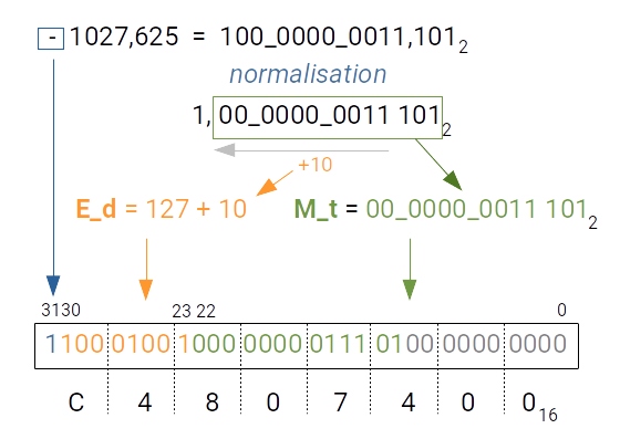 • l'exposant décalé est égal, par convention en 32 bits, à $127 + E$, dans notre cas $E = 10$, donc : $$E_d = 127 + 10 = 137_{10} = 1000\_1001_{2}$$