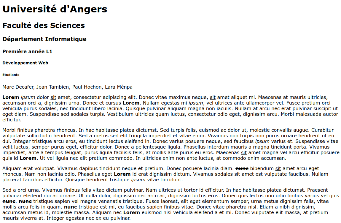 un paragraphe (p) qui contient le nom de quatre étudiants : "Marc Decafer, Jean Tambien, Paul Hochon, Lara Mènpa"