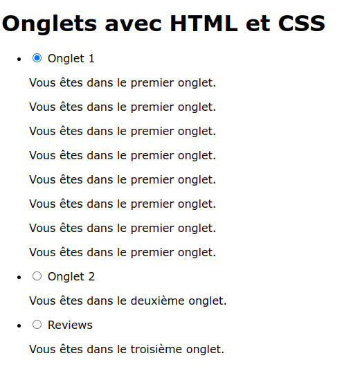• un champ input de type radio et de nom tabs et un identifiant id de libellé "onglet_1" pour le premier onglet, "onglet_2" pour le deuxième onglet et "onglet_3" pour le troisième onglet