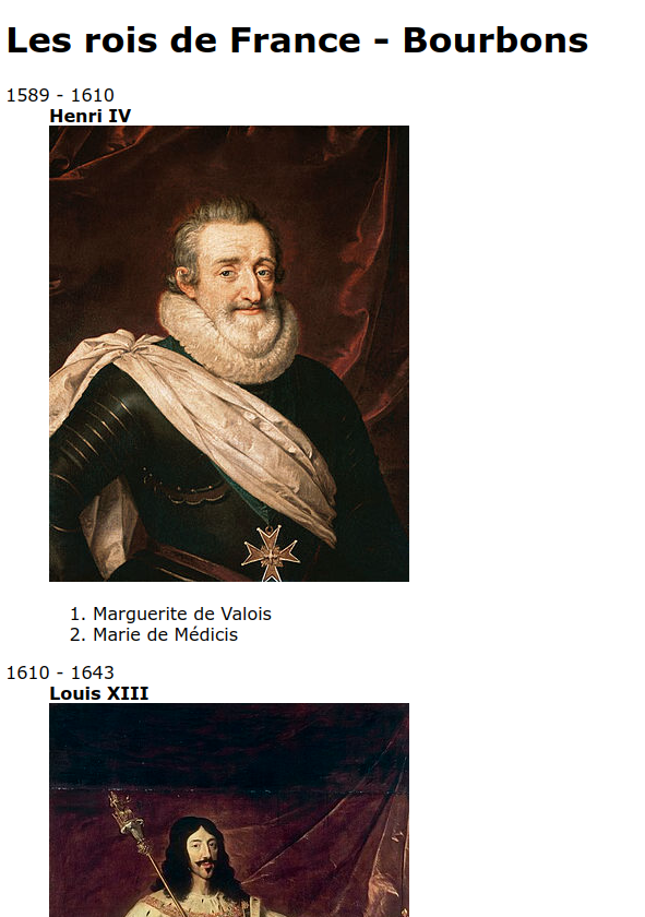 Le libellé du titre, de type h2, est "Les rois de France - Les Bourbons", puisqu'on va s'intéresser à la dynastie des Bourbons. On pourra notamment consulter ce site pour avoir quelques informations sur les cinq rois à considérer.