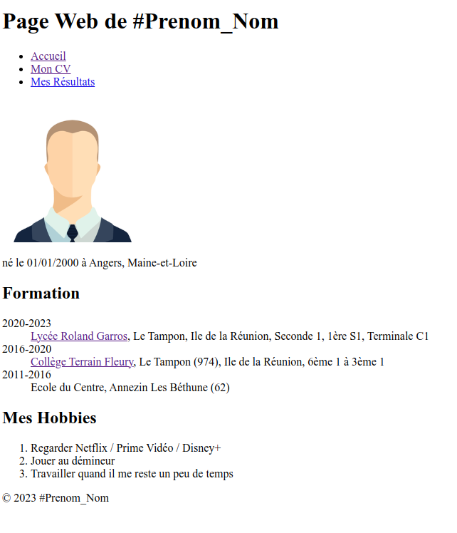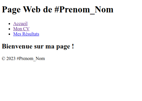- le titre de la page : "Page Web de #Prenom_Nom", où vous remplacerez le terme #Prenom_Nom par votre prénom suivi de votre nom