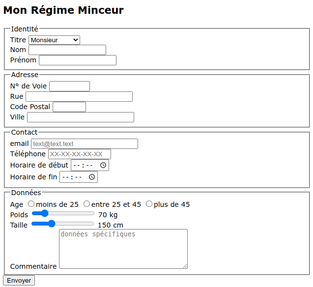 Puis, un formulaire qui comporte différentes parties (fieldset) :