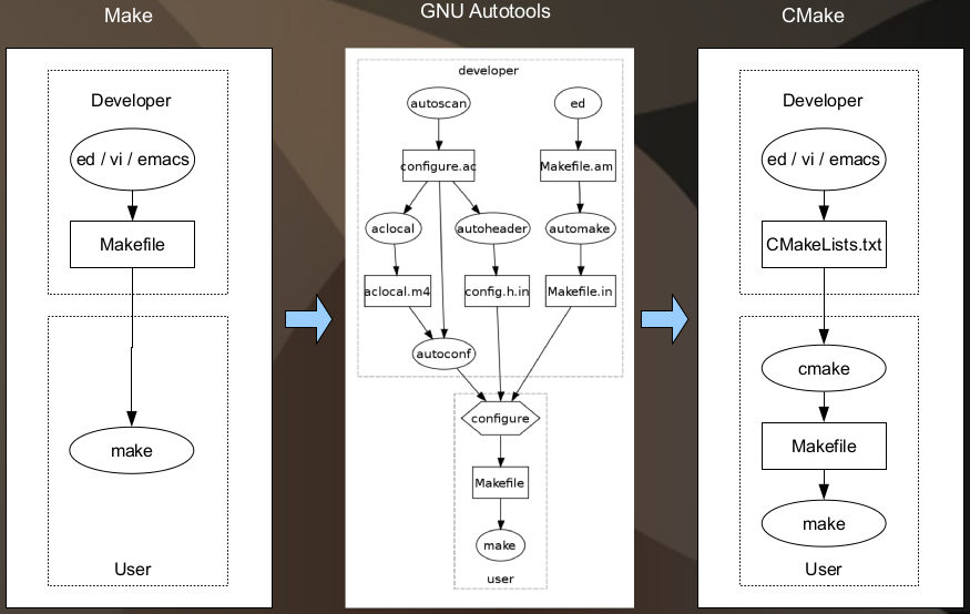 Sur l'image suivante on voit un comparatif schématisé de l'automatisation de la compilation avec trois outils différents.