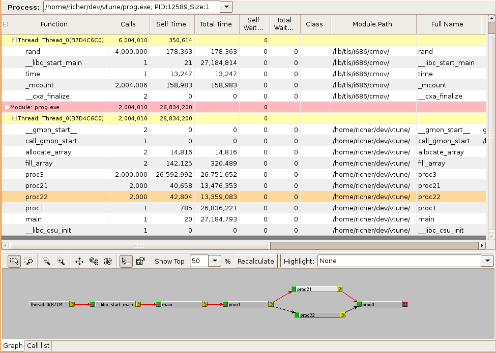 On compile le programme à étudier avec l'option de débugage -g puis il suffit de lancer le profilage. Attention cependant car certaines options peuvent augmenter le temps d'exécution d'un facteur 20 à 100 par rapport à une exécution normale.