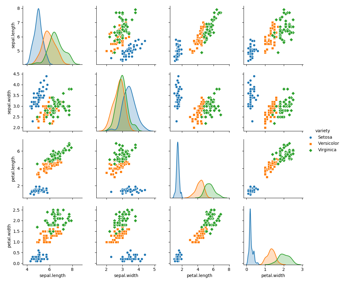 g2 = sns.pairplot(iris_df, hue='variety', markers=['o','s','D'])