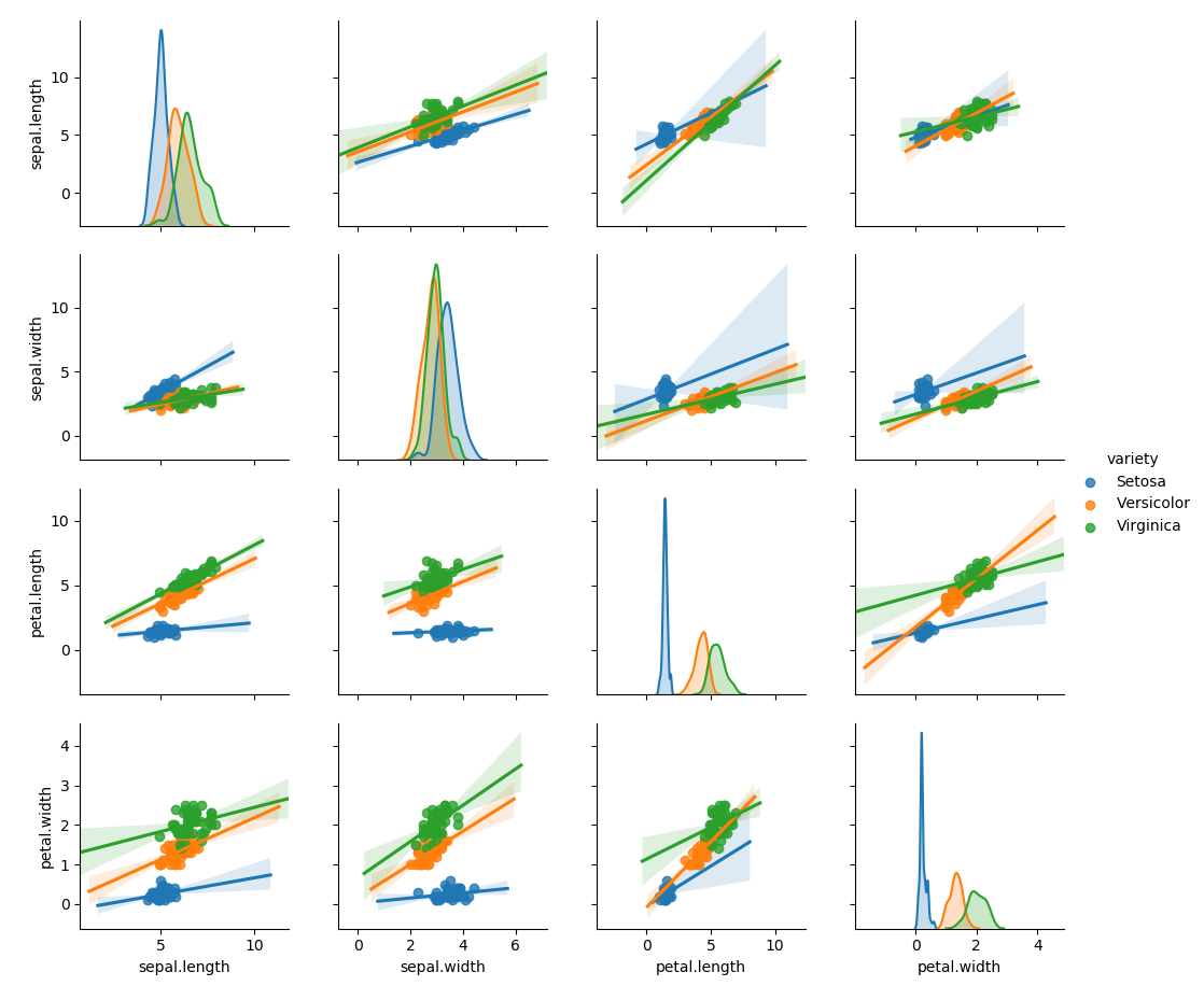 g3 = sns.pairplot(iris_df, hue='variety', kind = 'reg')