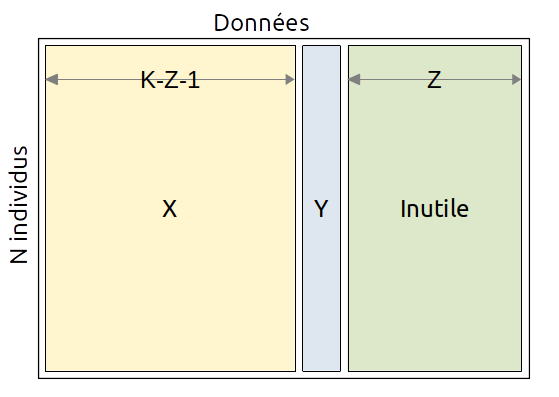 La matrice initiale des données $D$ est donc composée des données inutiles $I$, des données utiles à l'établissement de la relation $X$ et de la cible $y$ :