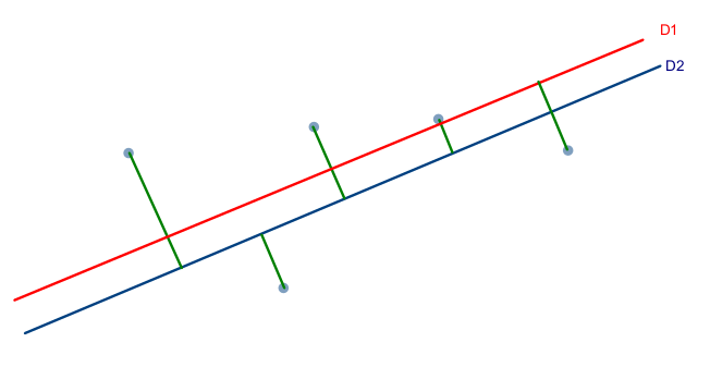 La droite ou l'hyperplan obtenu permet dans certains cas de classer (séparer) les données en deux classes, on parle alors de classifieur (issus de l'anglais classifier) mais le but de la régression est de rassembler les données plutôt que de les séparer. Nous verrons d'ailleurs que les SVM (Support Vector Machine) sont mieux adaptés à la classification.