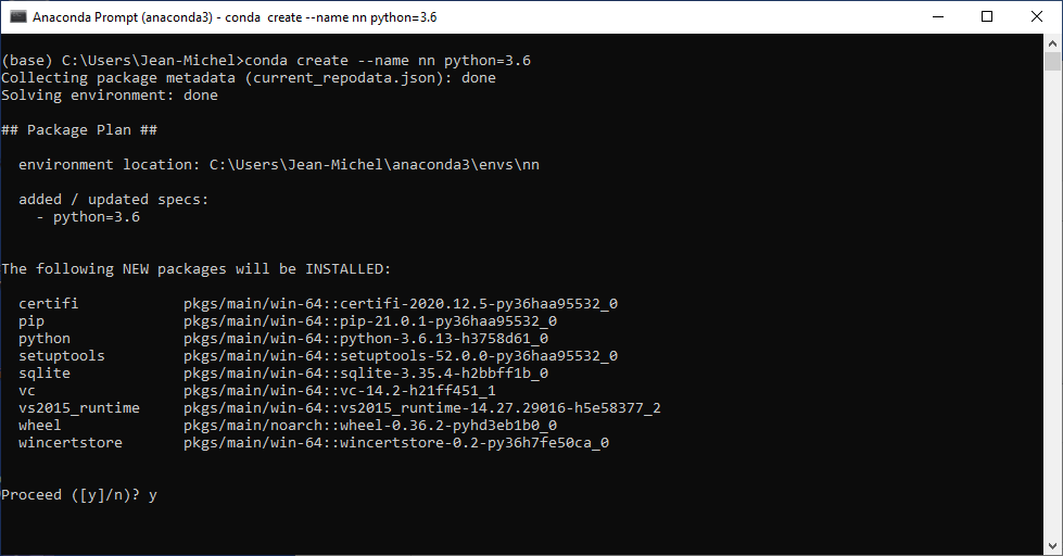 Dans le menu de Windows, chercher l'application Anaconda prompt et l'exécuter. Dans la console qui s'ouvre, taper les commandes suivantes et répondre 'y' à chaque fois que cela est demandé :