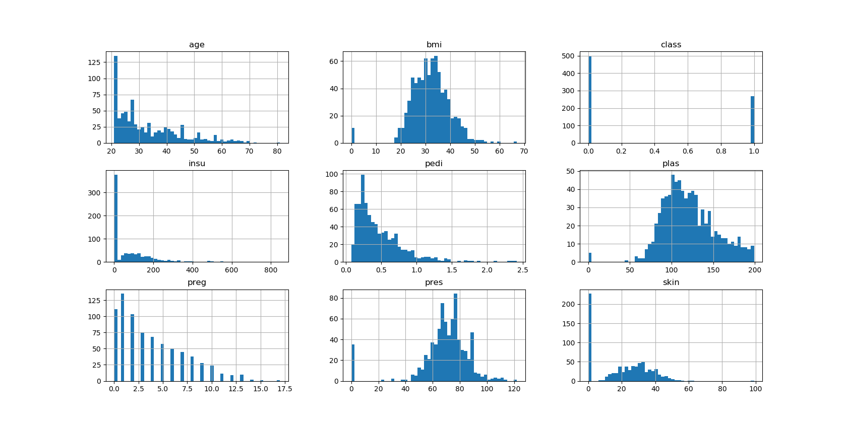 On note donc que les colonnes bmi, insu, plas, pres, skin possèdent des valeurs à 0 alors que ce ne devrait pas être le cas.