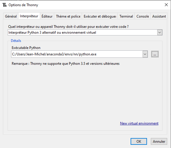 Enfin, pour pouvoir utiliser cet environnement avec Thonny, il faut modifier l'interpréteur comme sur l'image suivante (remplacez 'Jean-Michel' par votre nom utilisateur) :